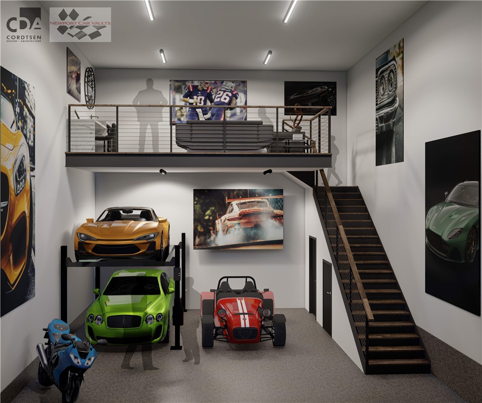 Newport Car Vaults – Luxury Garage Suites for storing your personal car collection. This individual garage suite provides 25′ ceiling height and floor space for 3 cars and or a lift for additional storage. The second-floor mezzanine is perfect for entertaining and/or personal office space. Half bathroom is discreetly tucked under the stairwell. Fully air conditioned and heated for year-round enjoyment and each garage suite is hardwired for private and high-speed internet. Owners have 24-hour access to their suite and additional external parking. Please note Newport Car Vaults garage suites are not zoned for residential living or commercial use
